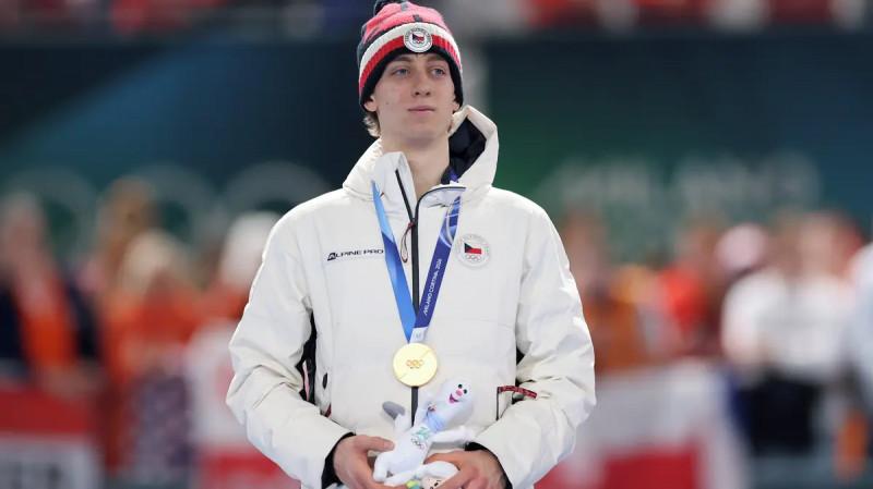 🇨🇿🥇 Metodej Jilek, 19letý český rychlobruslař, získal zlato na 10 000 m na OH v Miláně! S podporou Martiny Sáblíkové, která mu věnovala tričko „GOLDEN BOY“, dokázal přetavit očekávání v úspěch. Těší se na další růst! 👏 #Olympiáda#Jilek#Rychlobruslení