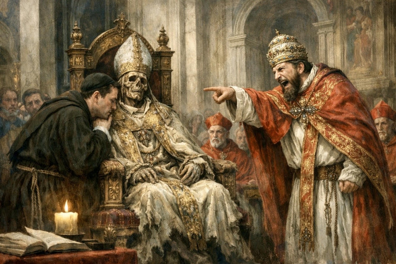 V roce 897 byl v Římě mrtvý papež Formosus postaven před absurdní soud, kde byl prohlášen vinným a jeho tělo zmrzačeno, což ilustruje, jak politické boje mohou devalvovat morální hodnoty a vést k rituálnímu násilí, jehož paralely dnes nacházíme v digitálních lynčích a mediálních popravách. #historie #církev #politika