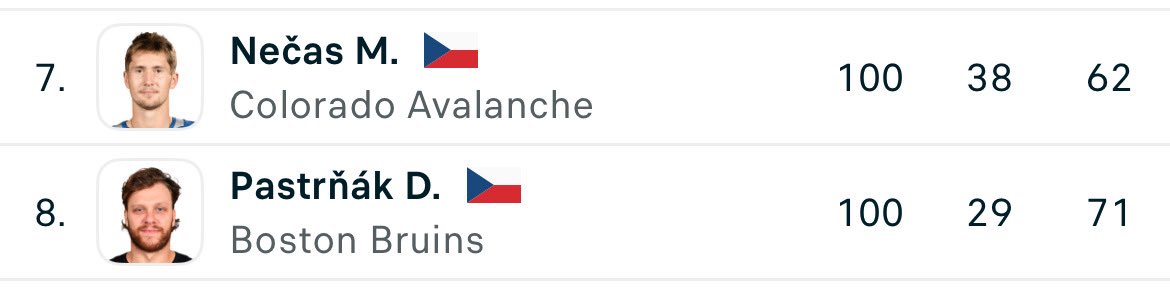 Stobodový 🇨🇿 klub. Jaromír Jágr 5x (149b max) David Pastrňák 4x (113b Max) Martin Nečas 1x 📸 #GoAvsGo …….. Petr Nedvěd 99 Milan Hejduk 98 Patrik Eliáš 96 Martin Straka 95 Robert Reichel 93 https://t.co/xfGFIHrHyT #Hokej #NHL #ČeskýSport