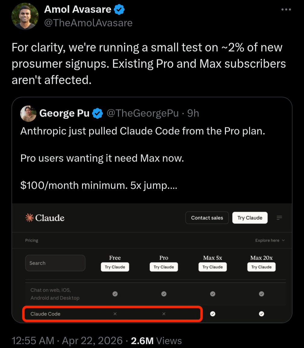 Anthropic zkouší, jak budou lidé reagovat na to, že by byl Claude Code dostupný jen v dražší verzi předplatného (100 dolarů a výše).